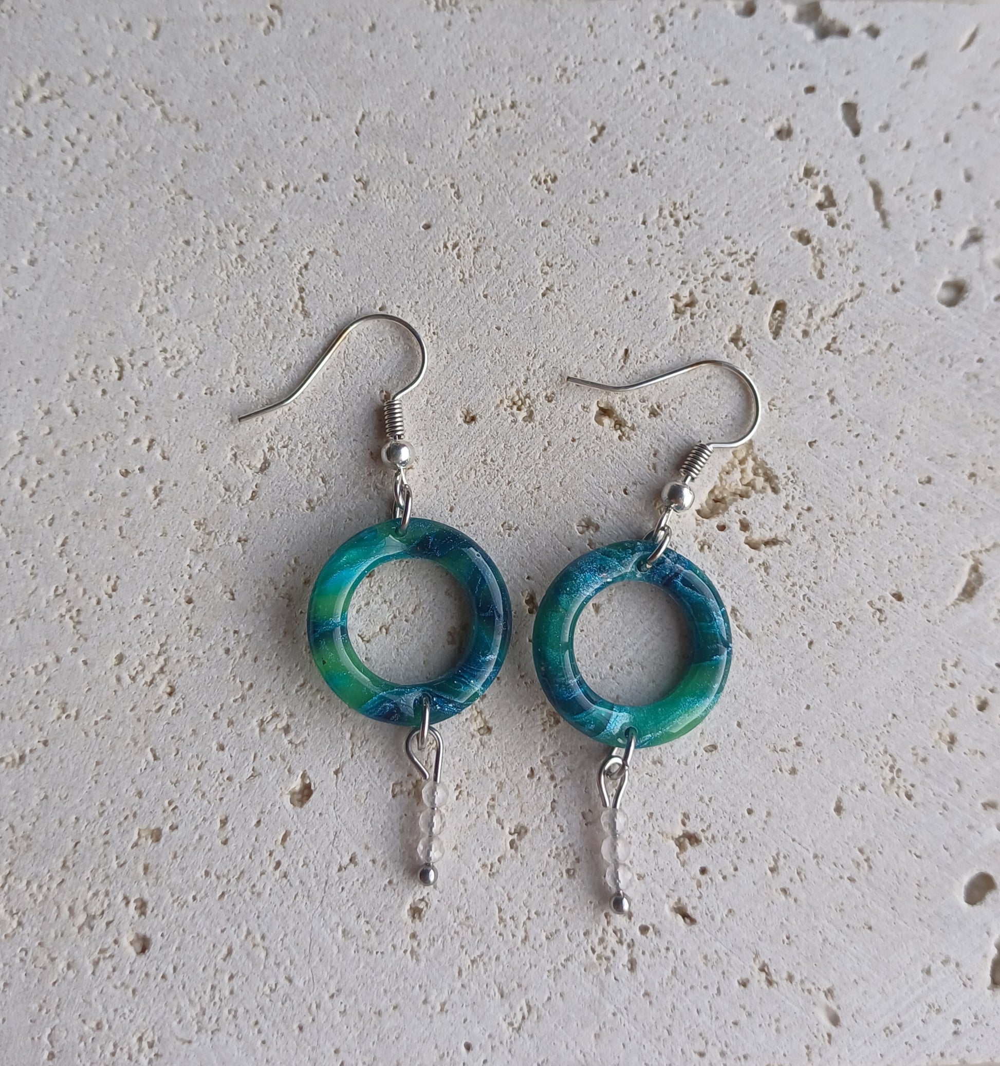 Afgewerkt met een nikkelvrij haakje, de kleistukjes werden voorzien van een glanslaag. De edelsteentjes zijn bergkristal, dit werkt zuiverend en vermindert negatieve energie. Heeft een positief effect op concentratie en intuïtie.
